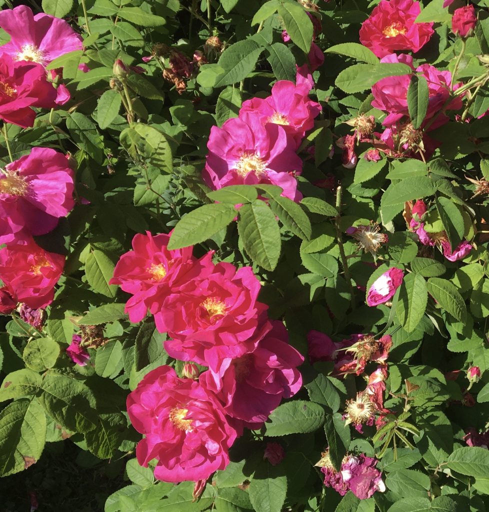 Perhaps my all-time favourite, I planted this 3ft high shrub rose (Rosa gallica/officinalis) in my garden about 10 years ago and she has gently spread throughout the flower bed with her simple suckering habit. The suckers, (underground runners producing new growth) are a problem not because they can’t be removed easily, but because each new growth brings more irresistible flowers, which, for the sake of the other plants, I have to force myself to remove! She has deep pink flowers with yellow centres, highly scented, that vibrantly contrast with lime green leaves. The rose originated from Persia and came to Europe in the 12th or 13th century, via returning knights in the Crusades and was the most commonly cultivated rose in Europe until the 1800s and has many healing properties. She flowers only once, in June, but the display lasts a good few weeks and is enough for me for the whole year.